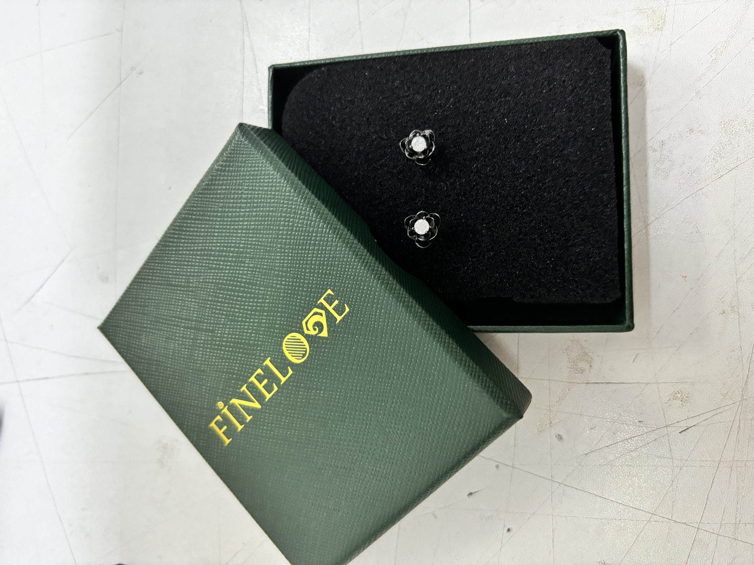 Signature FiNELOVE Craftsmanship – These exquisite floral studs showcase the brand’s dedication to delicate artistry, as seen in the precision-cut petals and embossed logo on the luxe green packaging.